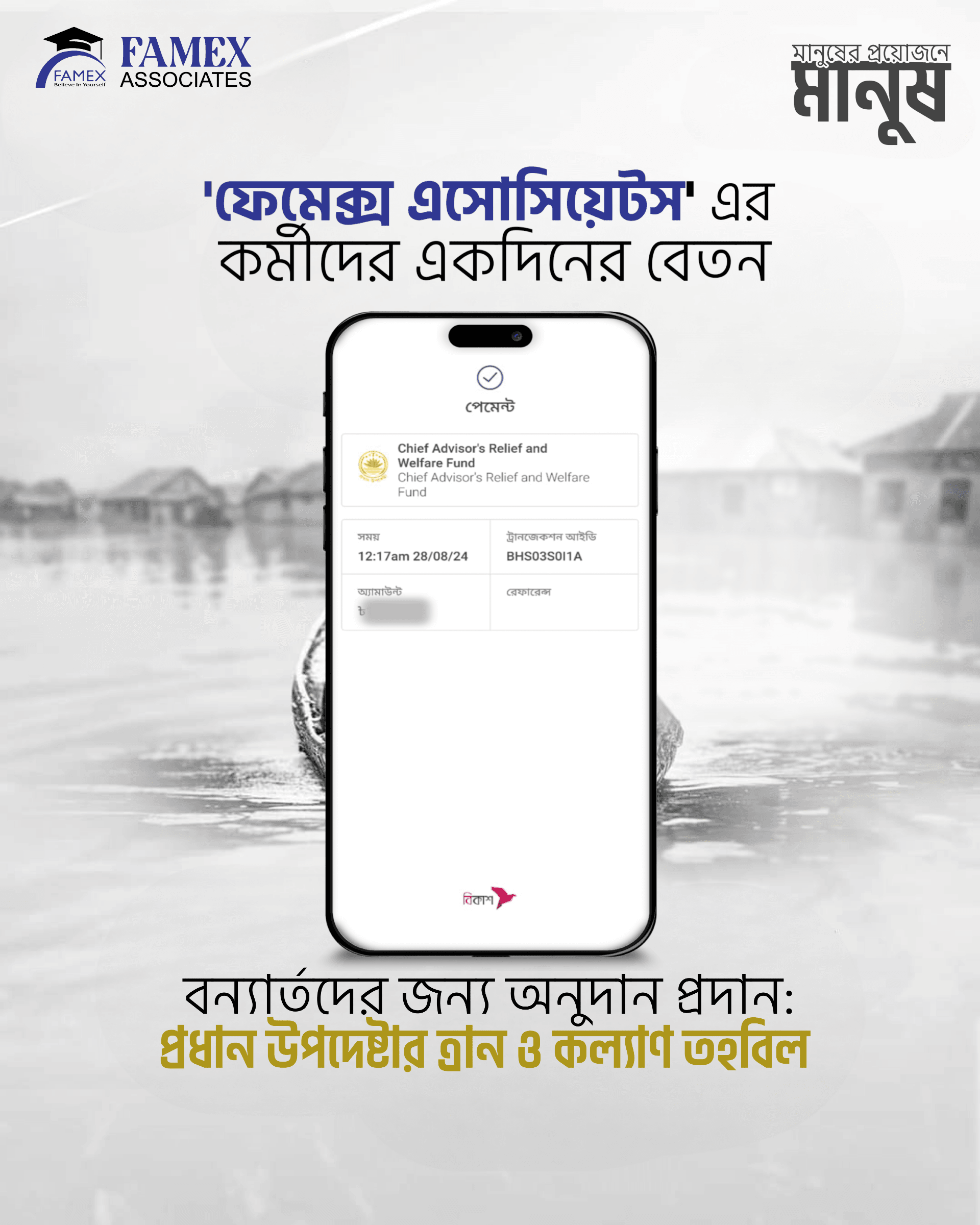 In times of crisis, the true spirit of humanity shines through acts of kindness and solidarity. At FAMEX ASSOCIATES, we believe in supporting our communities, especially during difficult times. Recently, our employees came together to make a meaningful contribution to the Chief Adviser's Relief Fund, donating one day's salary to aid those affected by the devastating floods in our region.